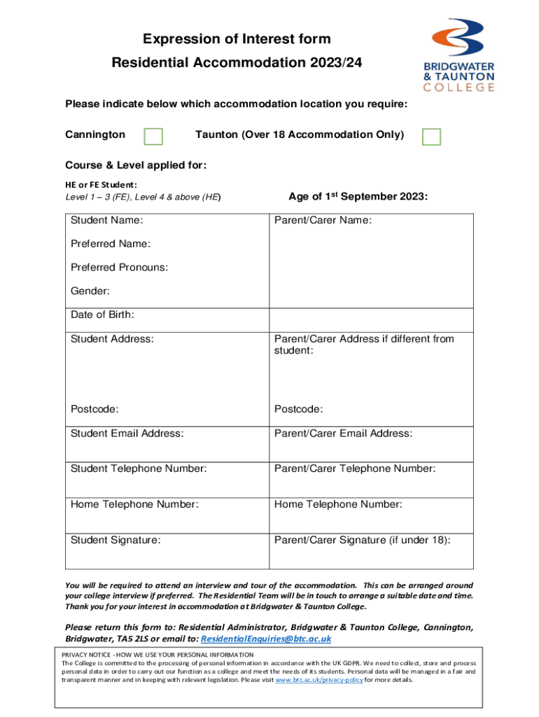 This form is intended for students applying for residential accommodation at Bridgwater & Taunton College for the academic year 2023/24. It collects personal information, accommodation preferences, and contact details for both the student and their parent/carer.