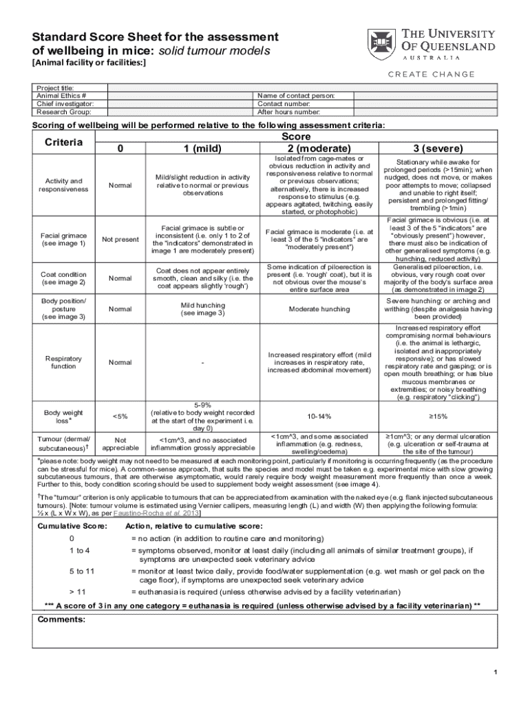 This document provides a standardized scoring sheet for assessing the wellbeing of mice in solid tumor models, detailing criteria for various wellbeing factors including activity, facial grimace, coat condition, and more. It includes guidelines for monitoring and actions based on cumulative scores.