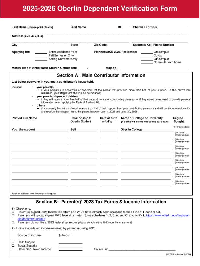 Read the instructions carefully provided with the Oberlin dependent verification form.