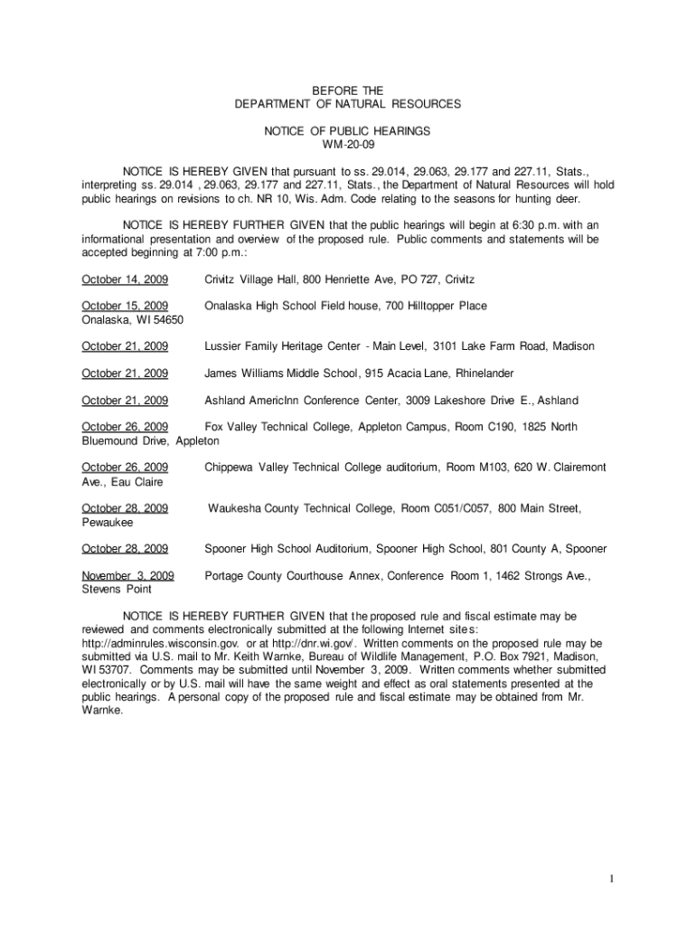 This document provides notice of public hearings by the Department of Natural Resources regarding revisions to hunting regulations for deer seasons in Wisconsin. It outlines the schedule, locations, and procedures for public comments on the proposed rule changes.