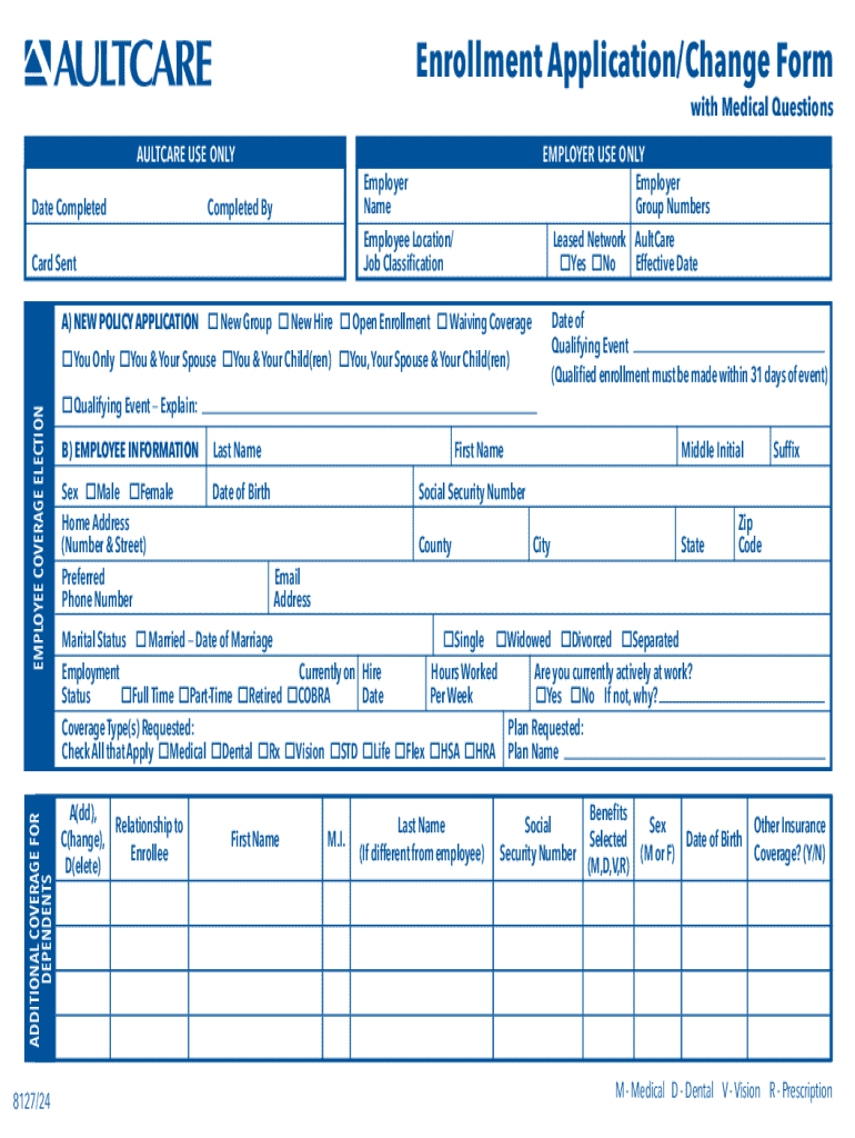 Este formulario se utiliza para inscribirse o realizar cambios en la cobertura de salud a través de AultCare. Incluye preguntas médicas y se requiere completar dentro de los 31 días de un evento