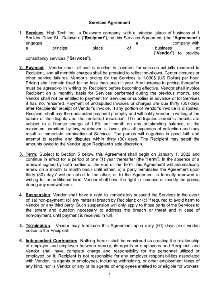 This Services Agreement outlines the terms and conditions under which High Tech Inc. engages a Vendor to provide consultancy services, including payment structure, termination clauses, obligations of both parties, and warranty information.