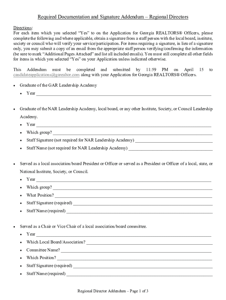 Este documento é um adendo necessário para os Diretores Regionais que devem ser preenchidos e assinados com base nas respostas da aplicação para os Oficiais dos REALTORS® da Geórgia. O formulário requer informações sobre experiências e participações em academias de liderança e cargos em associações locais, além de obter assinaturas de funcionários para verificação.