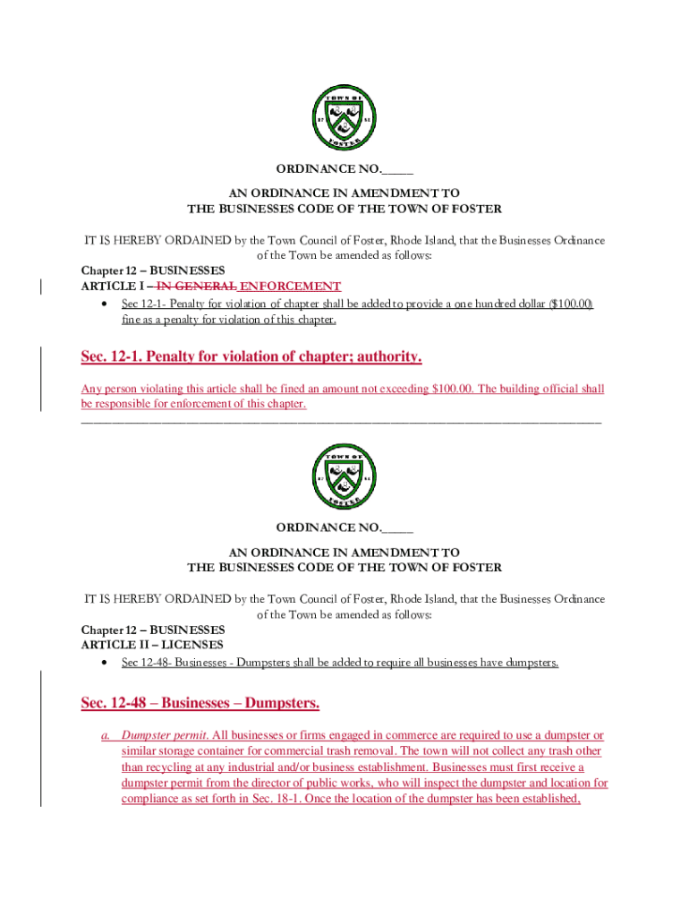 ORDINANCE NO.___ AN ORDINANCE IN AMENDMENT TO THE BUSINESSES CODE OF THE TOWN OF FOSTER IT IS HEREBY ORDAINED by the Town Council of Foster, Rhode Island, that the Businesses Ordinance of the Town be amended as follows: Chapter 12 BUSINESSES ARTICLE I IN GENERAL ENFORCEMENT Sec 121 Penalty for violation of chapter shall be added to provide a one hundred dollar ($100.00) fine as a penalty for violation of this chapter.Sec. 121. Penalty for violation of chapter; authority. Any person