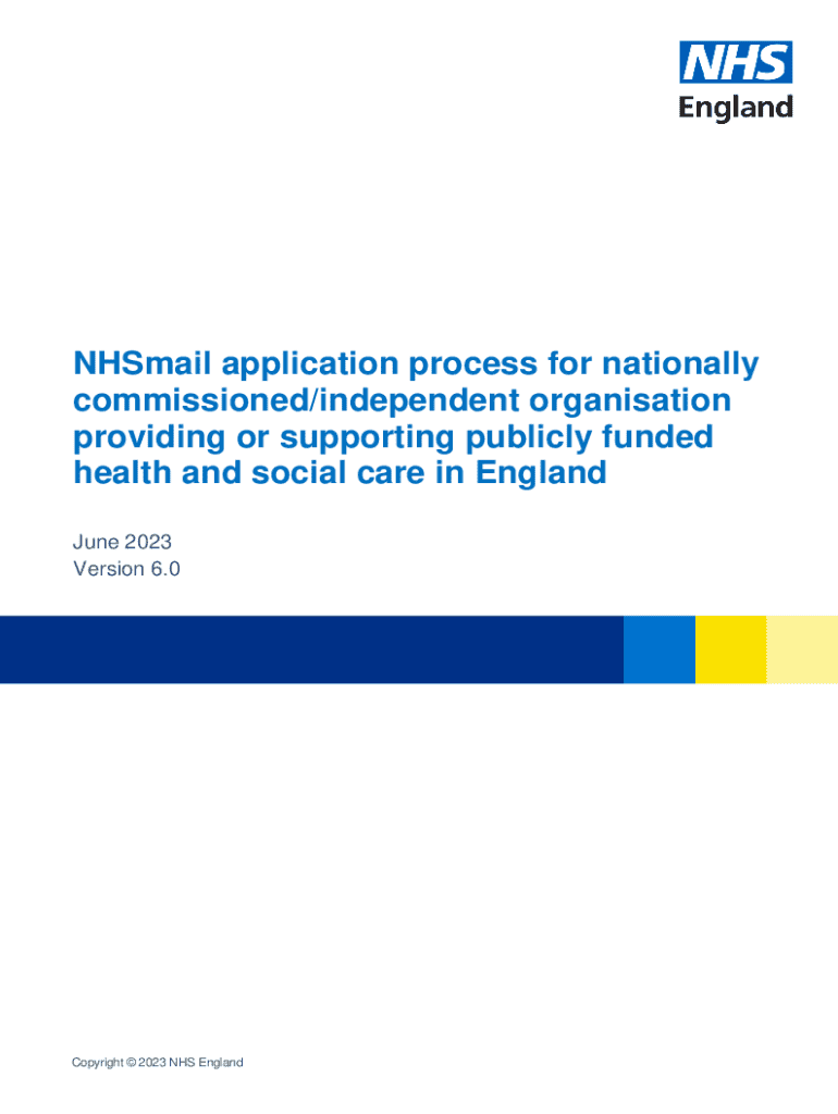 NHSmail application process for nationally commissioned/independent organisation providing or supporting publicly funded health and social care in England June 2023 Version 6.0 Month 2021Copyright 2023 NHS EnglandNHSmail application process for nationally commissioned/independent organisation providing or supporting publicly funded health and social care in EnglandContents 1 Introduction32 Applying for NHSmail accounts33 Further help44 Application for NHSmail5Copyright
