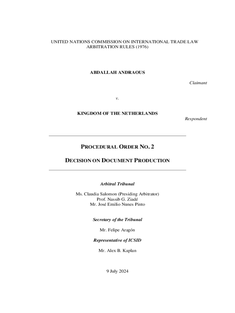 This document outlines the decisions regarding the production of documents in the arbitration case between Abdallah Andraous and the Kingdom of the Netherlands. It details the exchanges and requests