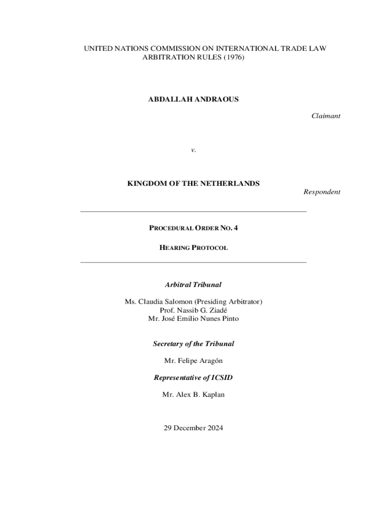 UNITED NATIONS COMMISSION ON INTERNATIONAL TRADE LAW ARBITRATION RULES (1976)ABDALLAH ANDRAOUS Claimantv.KINGDOM OF THE NETHERLANDS Respondent ___ PROCEDURAL ORDER NO. 4 HEARING PROTOCOL ___Arbitral Tribunal Ms. Claudia Salomon (Presiding Arbitrator) Prof. Nassib G. Ziad Mr. Jos Emilio Nunes PintoSecretary of the Tribunal Mr. Felipe Aragn Representative of ICSID Mr. Alex B. Kaplan29 December 2024Abdallah Andraous v. Kingdom of the Netherlands ICSID Case No. UNCT/23/3 Procedural Order No