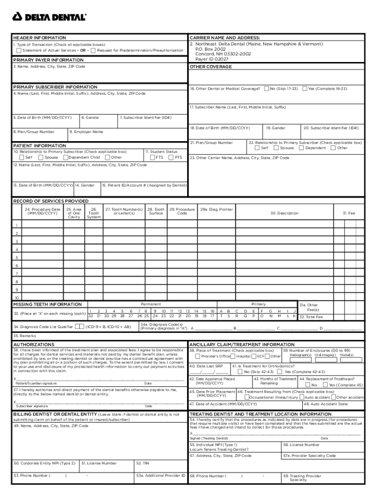HEADER INFORMATIONPRIMARY PAYER INFORMATIONCARRIER NAME AND ADDRESS: 2. Northeast Delta Dental (Maine, New Hampshire & Vermont) P.O. Box 2002 Concord, NH 033022002 Payer ID 020273. Name, Address, City, State, ZIP CodeOTHER COVERAGEPRIMARY SUBSCRIBER INFORMATION16. Other Dental or Medical Coverage?1. Type of Transaction (Check all applicable boxes) Statement of Actual Services OR Request for Predetermination/PreauthorizationNo (Skip 1723)Yes (Complete 1623)4. Name (Last,