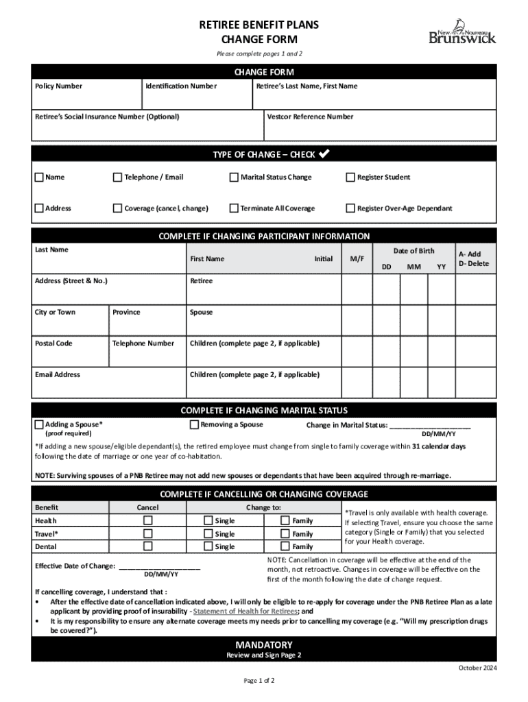 This form is used by retirees to make changes to their benefit plans, including updating personal information, changing coverage, registering or terminating dependants, and authorizing privacy consent