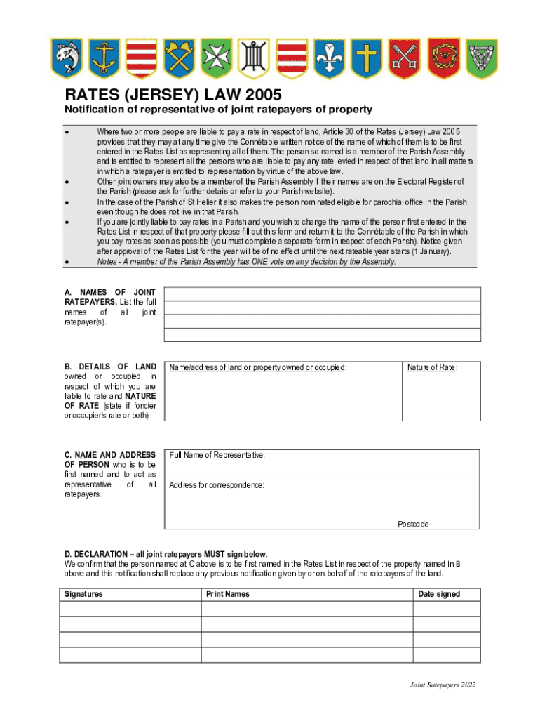 RATES (JERSEY) LAW 2005 Notification of representative of joint ratepayers of property Where two or more people are liable to pay a rate in respect of land, Article 30 of the Rates (Jersey) Law 2005 provides that they may at any time give the Conntable written notice of the name of which of them is to be first entered in the Rates List as representing all of them. The person so named is a member of the Parish Assembly and is entitled to represent all the persons who are liable