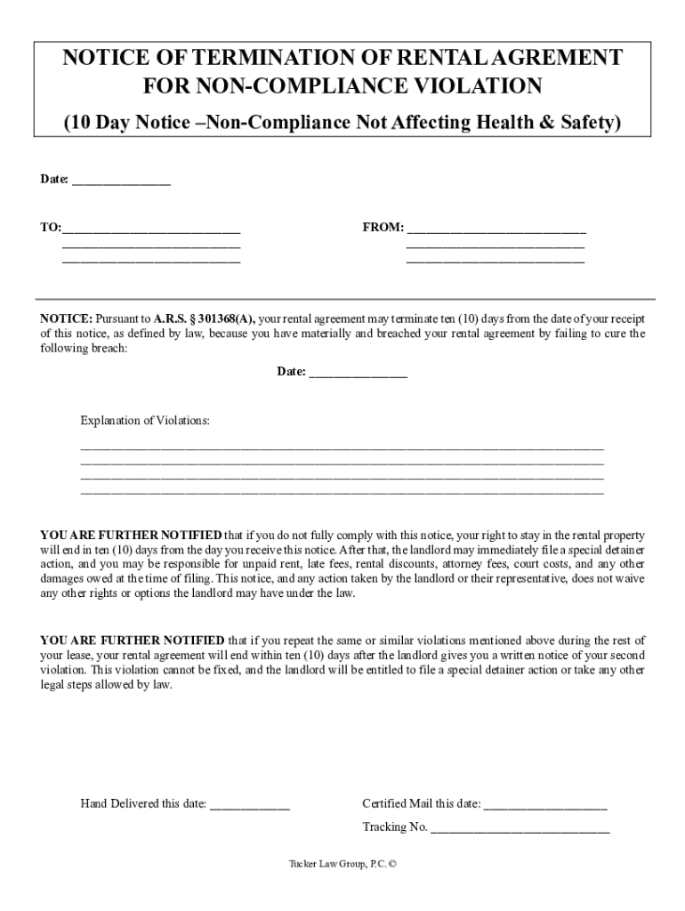 NOTICE OF TERMINATION OF RENTAL AGREMENT FOR NONCOMPLIANCE VIOLATION (10 Day Notice NonCompliance Not Affecting Health & Safety) Date: ___ TO:___ ___ ___FROM: ___ ___ ___NOTICE: Pursuant to A.R.S.