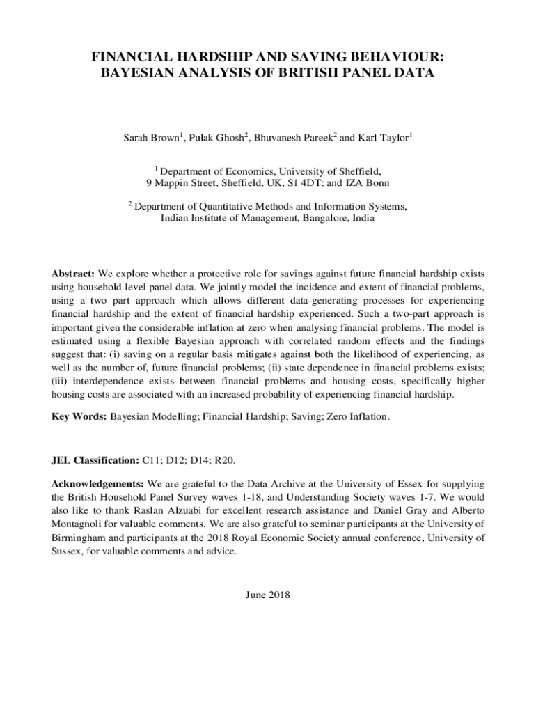 FINANCIAL HARDSHIP AND SAVING BEHAVIOUR: BAYESIAN ANALYSIS OF BRITISH PANEL DATASarah Brown1, Pulak Ghosh2, Bhuvanesh Pareek2 and Karl Taylor1 1Department of Economics, University of Sheffield, 9 Mappin Street, Sheffield, UK, S1 4DT; and IZA Bonn 2Department of Quantitative Methods and Information Systems, Indian Institute of Management, Bangalore, IndiaAbstract: We explore whether a protective role for savings against future financial hardship exists using household level panel data. We