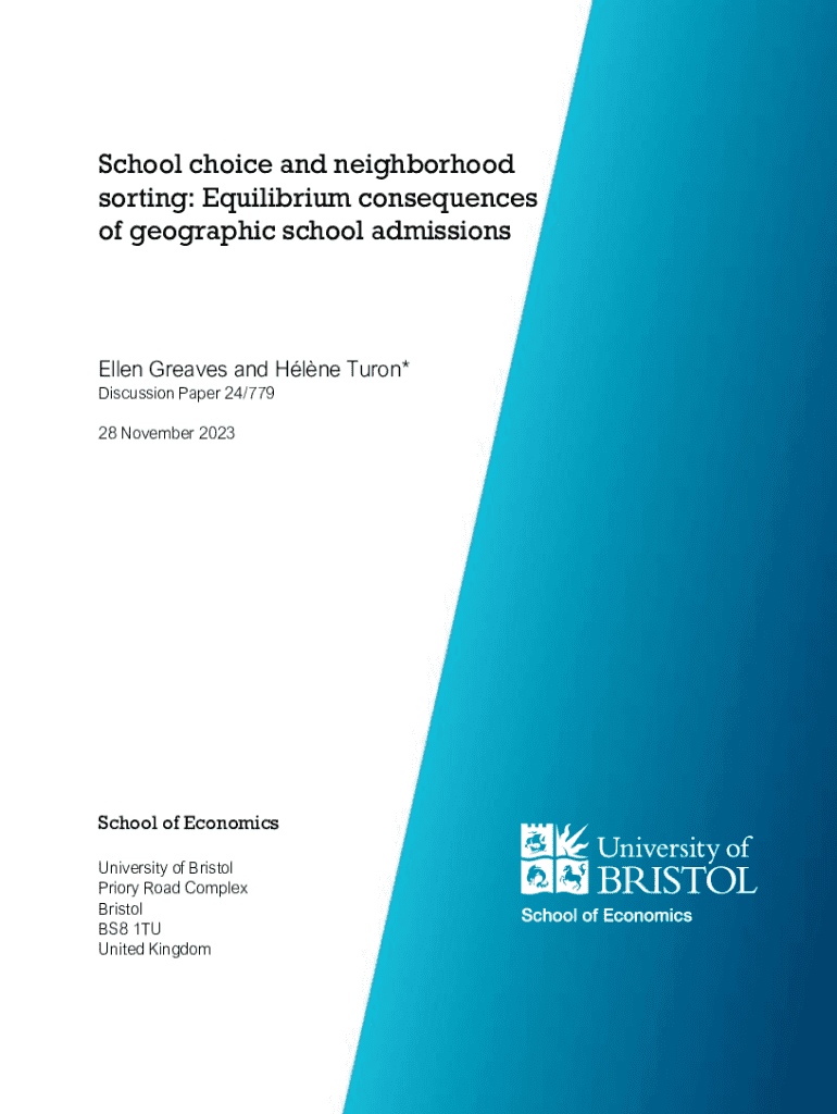 School choice and neighborhood sorting: Equilibrium consequences of geographic school admissionsEllen Greaves and Hlne Turon* Discussion Paper 24/779 28 November 2023School of Economics University of Bristol Priory Road Complex Bristol BS8 1TU United KingdomSchool choice and neighborhood sorting: Equilibrium consequences of geographic school admissions Ellen Greaves and Helene Turon* November 28, 2023 Geographic school admissions criteria bind residential and school choices for some