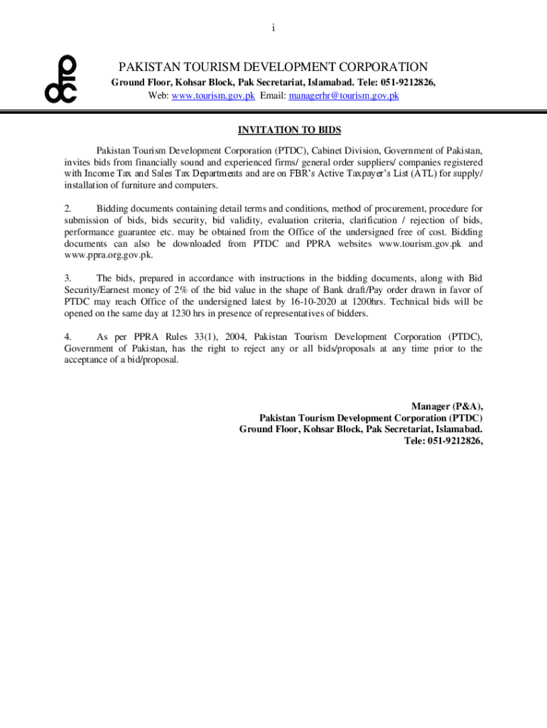 This document invites bids from registered suppliers for the supply and installation of furniture and computers for Pakistan Tourism Development Corporation. It includes guidelines for bid preparation,