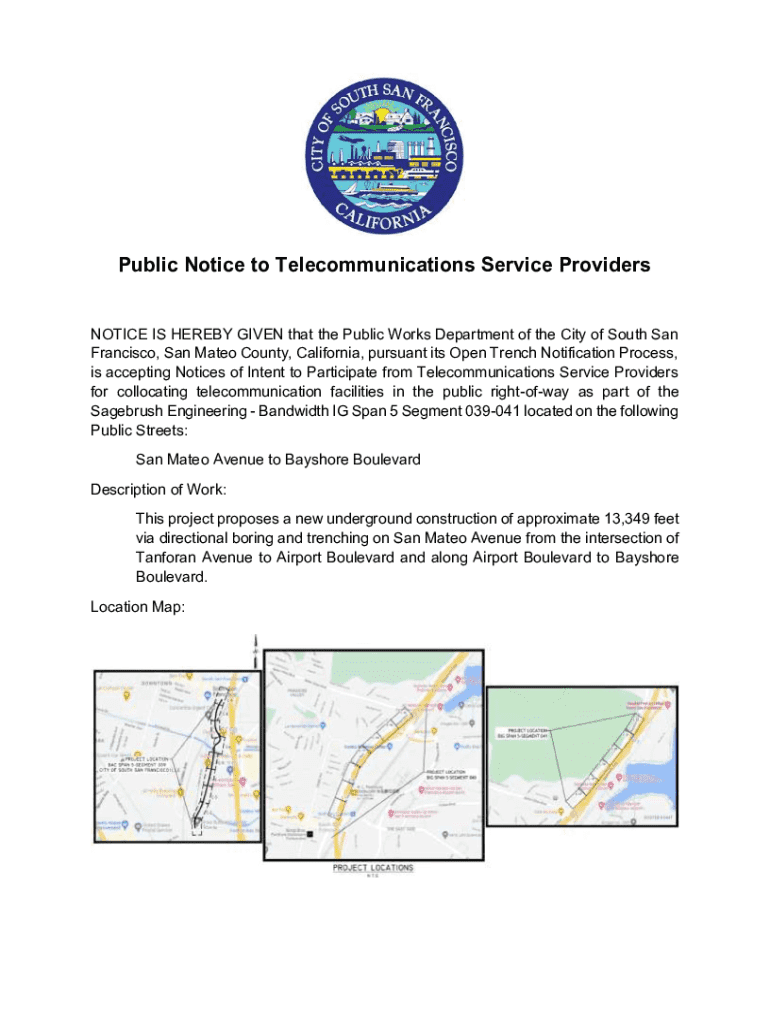 This document serves as a notice to telecommunications service providers regarding the opportunity to collocate telecommunication facilities in the public right-of-way in South San Francisco, as part