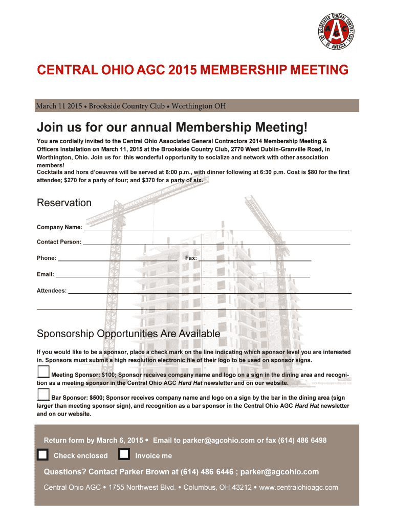 CENTRAL OHIO AGC 2015 MEMBERSHIP MEETING, March 11, 2015, Brookside Country Club Worthington OH Join us for our annual Membership Meeting! You are cordially invited to the Central Ohio Associated