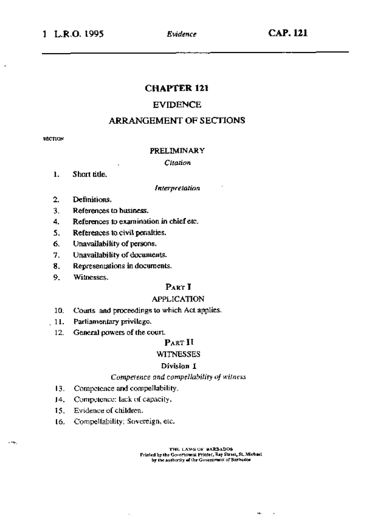 CAP. 121Evidence1 L.R.O. 1995CHAPTER 121 EVIDENCE ARRANGEMENTOF SECTIONSSBCIIONPRELIMINARY Citation1.Short title. Interpretation2.Definitions.3. 4.References to business. References to examination in chief etc.5.References to civil penalties.6.Unavailability of persons.7.Unavailability of documents.8.Representations in documents.9.Witnesses.PARTI APPLICATION 10. , 11. 12.Courts and proceedings to which Act applies. Parliamentary privilege. General powers of the court