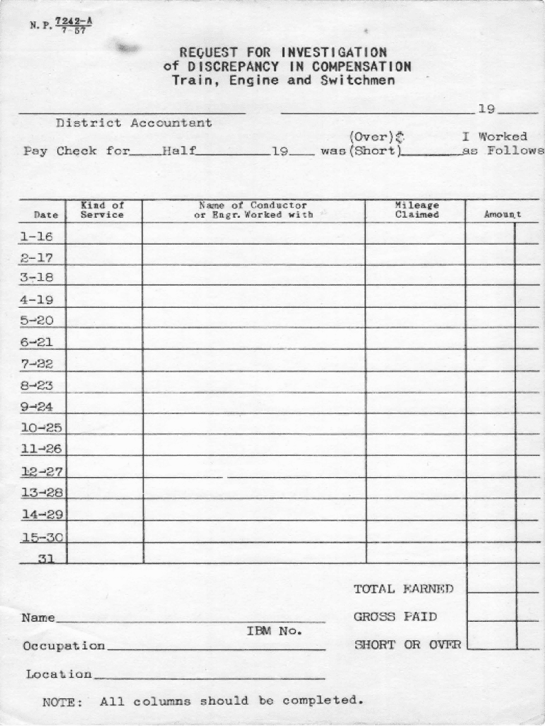 This document is a formal request for investigation regarding discrepancies in compensation for train, engine, and switchmen. It includes details about the service rendered, mileage claimed, and payment discrepancies.