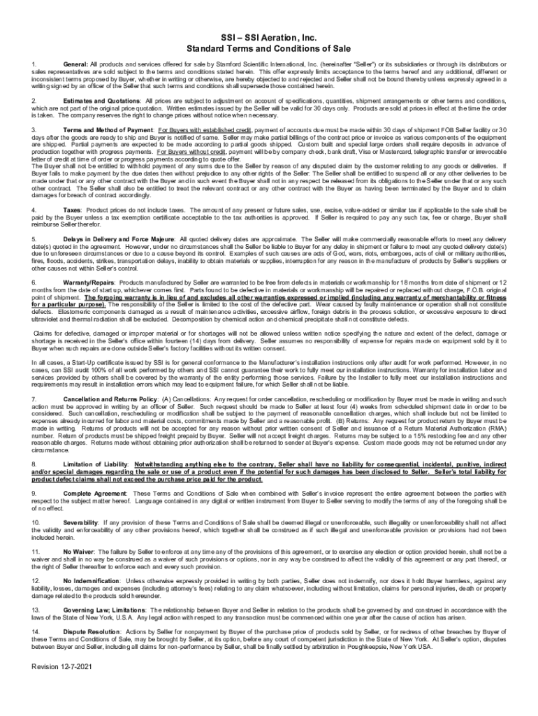 SSI SSI Aeration, Inc. Standard Terms and Conditions of Sale 1. General: All products and services offered for sale by Stamford Scientific International, Inc. (hereinafter Seller) or its subsidiaries or through its distributors or sales representatives are sold subject to the terms and conditions stated herein. This offer expressly limits acceptance to the terms hereof and any additional, different or inconsistent terms proposed by Buyer, whether in writing or otherwise, are hereby objected