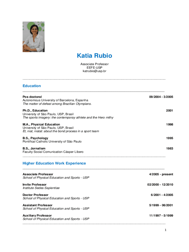 Katia Rubio Associate Professor EEFEUSP katrubio@usp.br ___Education ___ Pos doctoral Autonomous University of Barcelona, Espanha The matter of defeat among Brazilian Olympians.09/2004 3/2005Ph.D., Education University of So Paulo, USP, Brasil The sports imagery: the contemporay athlete and the Hero mithy2001M.A., Physical Education University of So Paulo, USP, Brasil Et, niat, niatat: about the bond process in a sport team1998B.S., Psychology Pontifical Catholic University of So Paulo1995B
