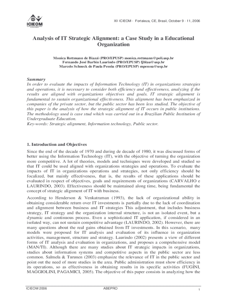 XII ICIEOM Fortaleza, CE, Brasil, October 9 11, 2006Analysis of IT Strategic Alignment: a Case Study in a Educational Organization Monica Rottmann de Biazzi (PRO/EPUSP) monica.rottmann@poli.usp.br Fernando Jos Barbin Laurindo (PRO/EPUSP) fjblau@usp.br Marcelo Schneck de Paula Pessa (PRO/EPUSP) mpessoa@usp.brSummary In order to evaluate the impacts of Information Technology (IT) in organizations strategies and operations, it is necessary to consider both efficiency and effectiveness, analyzing