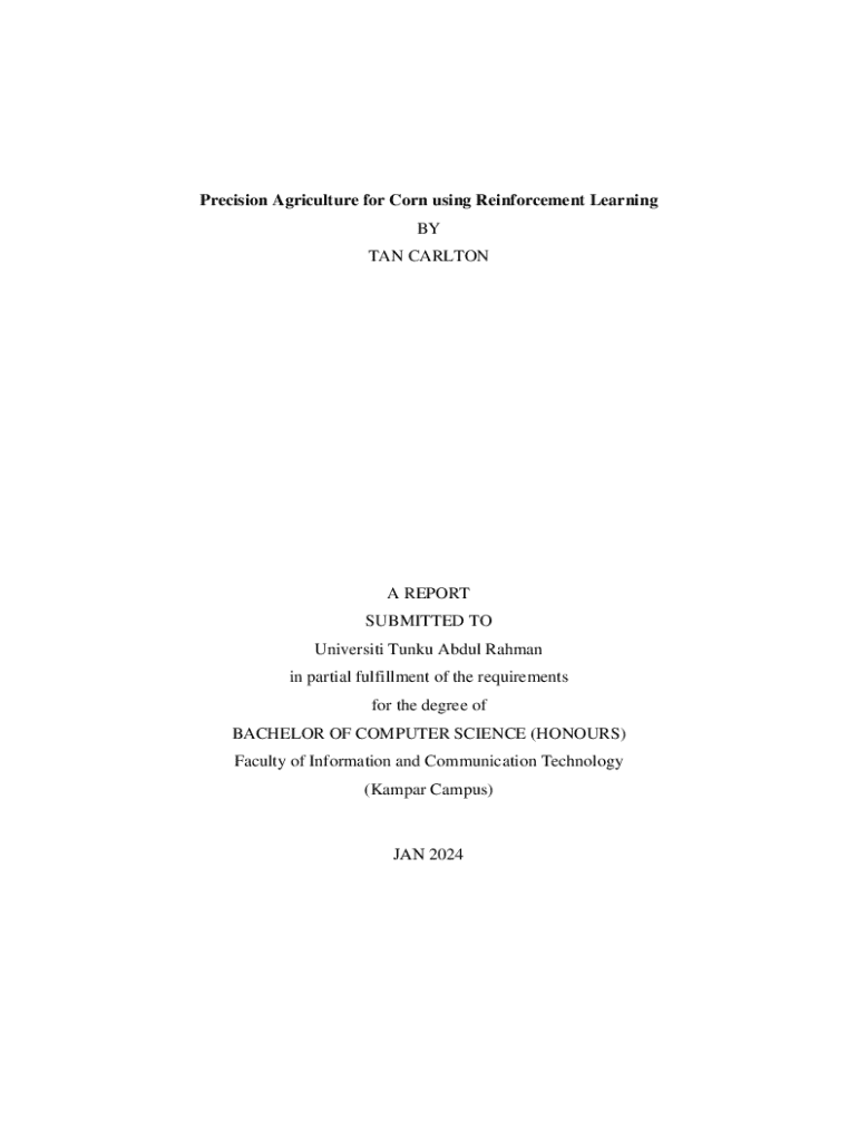 Precision Agriculture for Corn using Reinforcement Learning BY TAN CARLTONA REPORT SUBMITTED TO Universiti Tunku Abdul Rahman in partial fulfillment of the requirements for the degree of BACHELOR OF COMPUTER SCIENCE (HONOURS) Faculty of Information and Communication Technology (Kampar Campus)JAN 2024UNIVERSITI TUNKU ABDUL RAHMANREPORT STATUS DECLARATION FORMTitle:___Precision Agriculture for Corn using Reinforcement Learning___ ___ ___ Academic Session: __JAN 2024__I___TAN CARLTON___ (CAPITAL