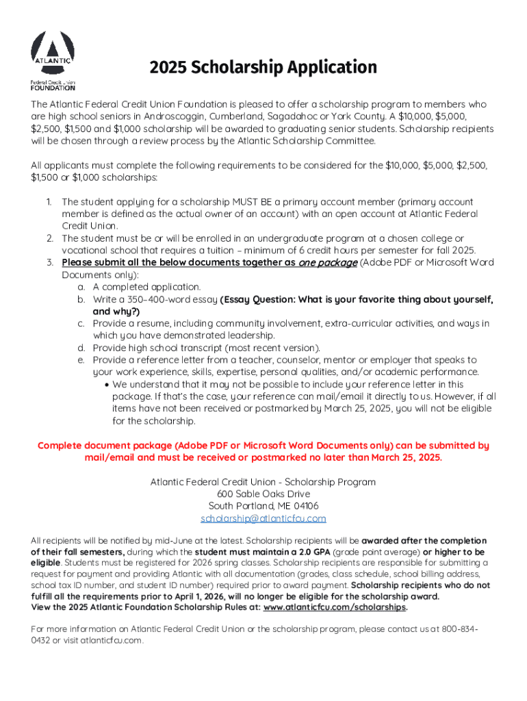 The Atlantic Federal Credit Union Foundation is offering scholarships to high school seniors in specific Maine counties. Scholarships ranging from $1,000 to $10,000 will be awarded based on a review