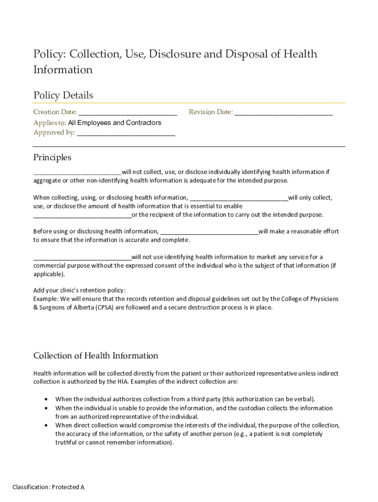 Policy: Collection, Use, Disclosure and Disposal of Health Information Policy Details Creation Date: ___Revision Date: ___Applies to: All Employees and Contractors Approved by: ___Principles ___will not collect, use, or disclose individually identifying health information if aggregate or other nonidentifying health information is adequate for the intended purpose. When collecting, using, or disclosing health information, ___will only collect, use, or disclose the amount of health information