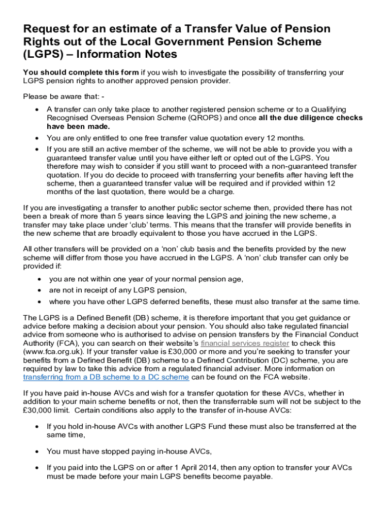 Este formulario debe completarse si desea investigar la posibilidad de transferir sus derechos de pensión del LGPS a otro proveedor de pensiones aprobado. Se proporciona información sobre los requisitos y condiciones para la transferencia de fondos de pensiones, así como la importancia de obtener asesoramiento financiero regulado antes de realizar cualquier transferencia.