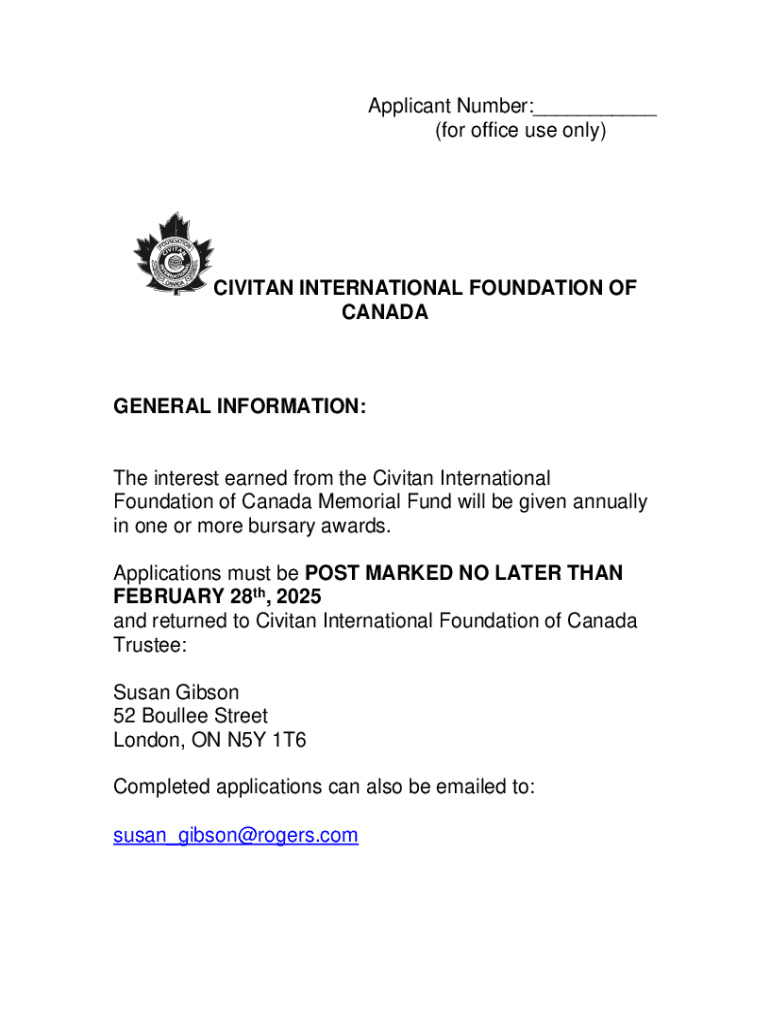 This application form is for the Civitan International Foundation of Canada bursary awards, aimed at supporting individuals who meet specific criteria related to Civitan involvement and community engagement. Completed applications must be submitted by February 28th, 2025.