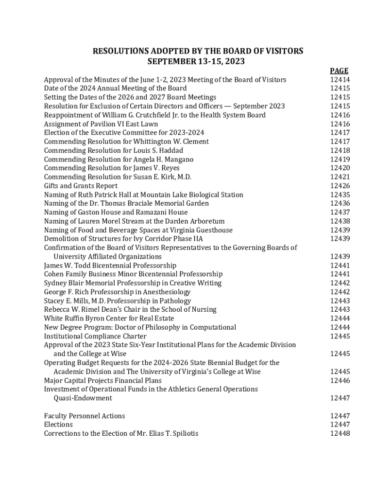 This document outlines the resolutions adopted during the Board of Visitors meeting held on September 13-15, 2023. It includes approval of meeting minutes, resolutions for annual meetings, reappointments, naming of buildings, financial plans, and various personnel actions related to the University of Virginia.