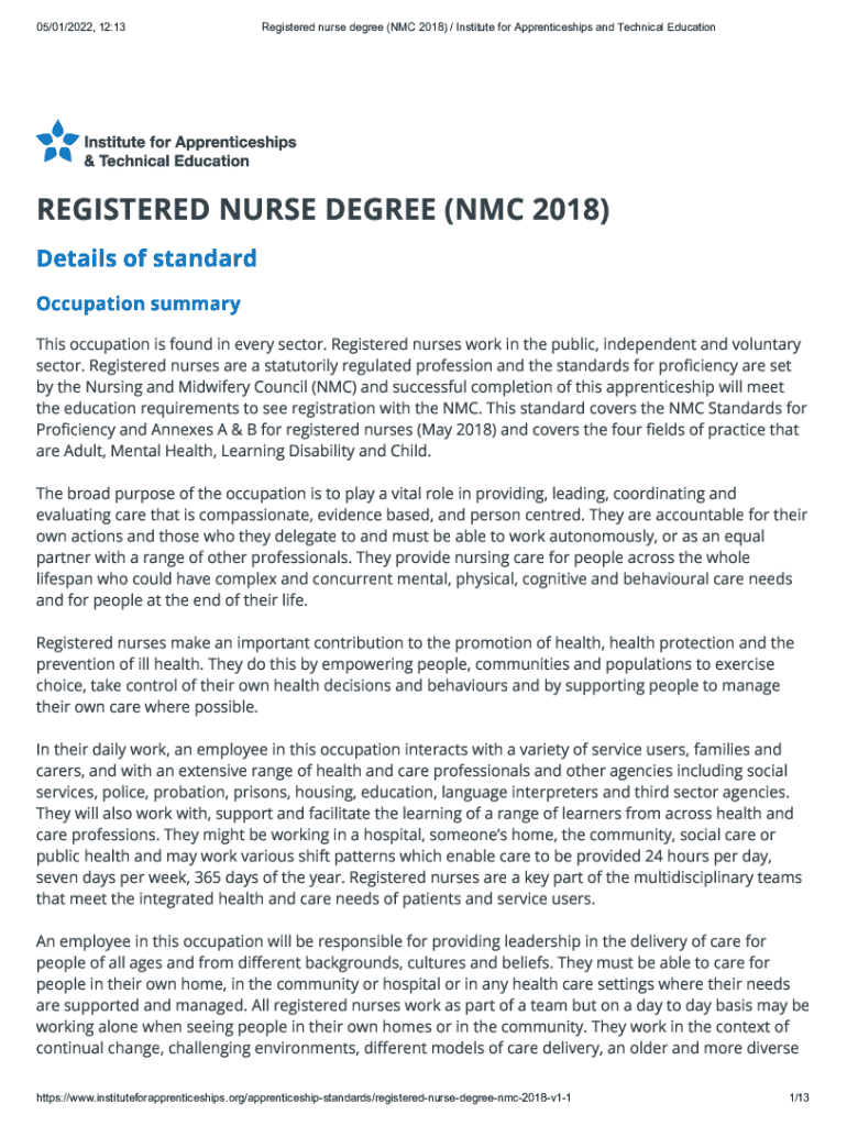 This document outlines the standards and requirements for the Registered Nurse Degree apprenticeship, detailing the skills, knowledge, and behaviours necessary to provide compassionate, evidence-based nursing care across various sectors. The document covers duties, entry requirements, occupational details, and qualifications necessary for registration with the Nursing and Midwifery Council.