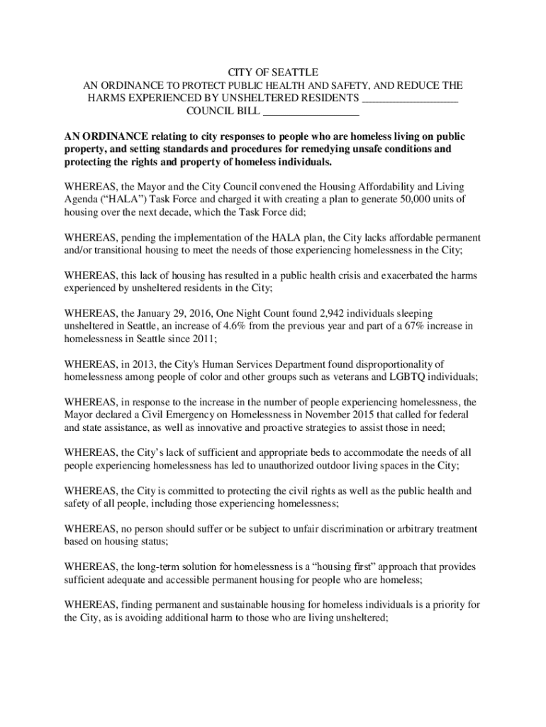 CITY OF SEATTLE AN ORDINANCE TO PROTECT PUBLIC HEALTH AND SAFETY, AND REDUCE THE HARMS EXPERIENCED BY UNSHELTERED RESIDENTS ___ COUNCIL BILL ___ AN ORDINANCE relating to city responses to people who are homeless living on public property, and setting standards and procedures for remedying unsafe conditions and protecting the rights and property of homeless individuals. WHEREAS, the Mayor and the City Council convened the Housing Affordability and Living Agenda (HALA) Task Force and charged