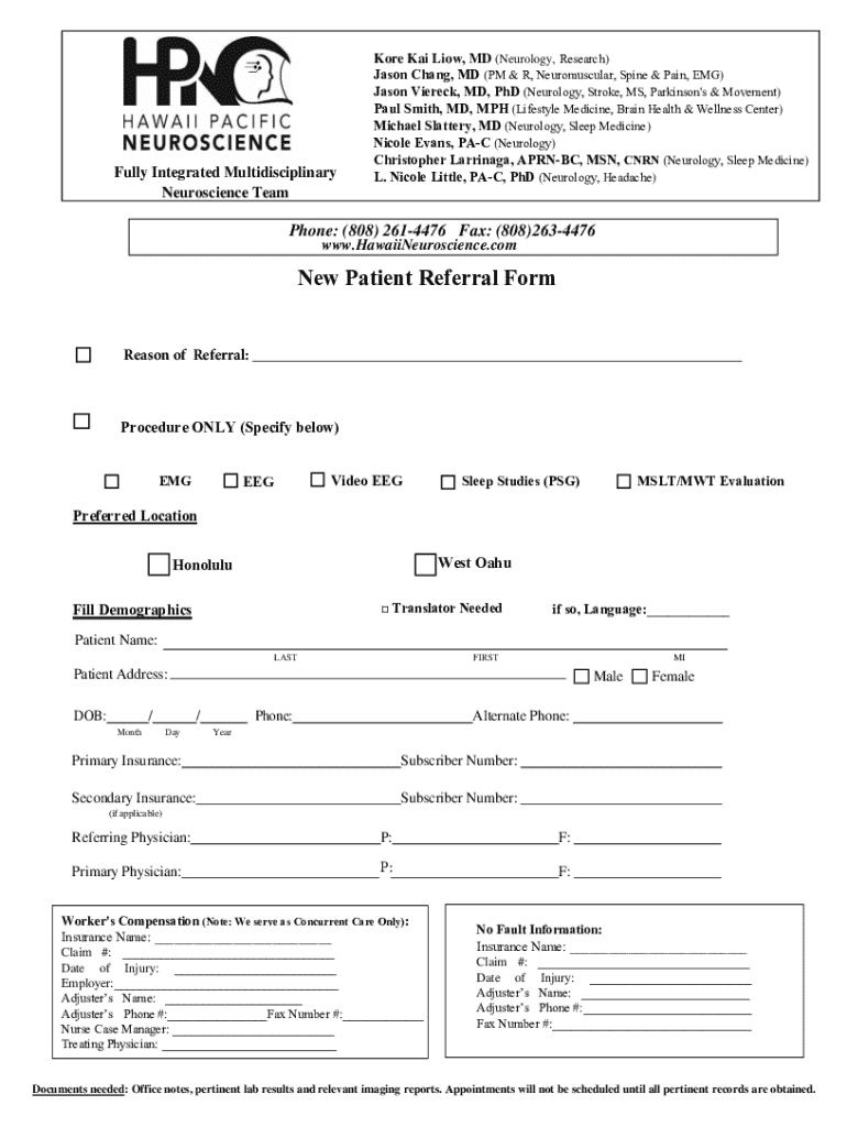 This form is used to refer new patients to our Fully Integrated Multidisciplinary Neuroscience Team. It collects essential information regarding the patient\'s demographics, referral reasons, insurance