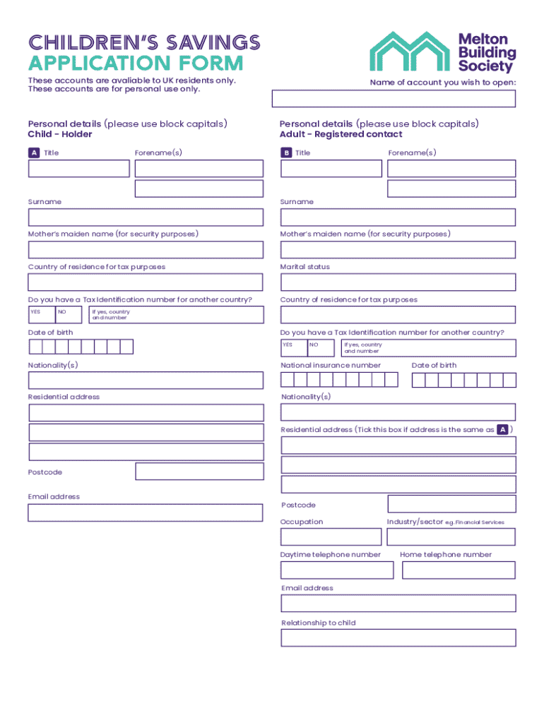 This form is used by UK residents to apply for a children\'s savings account, detailing personal information about the child and the adult registered contact, along with terms for account usage and consent for marketing.