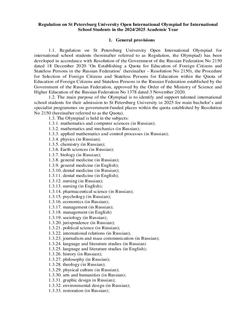 This document outlines the regulations for the St Petersburg University Open International Olympiad aimed at identifying and supporting talented international school students for admission to St Petersburg University under a government-funded quota for the 2024/2025 academic year. It includes details on eligibility, registration procedures, required documents, subjects offered, and guidelines for the participation of foreign citizens and stateless persons.