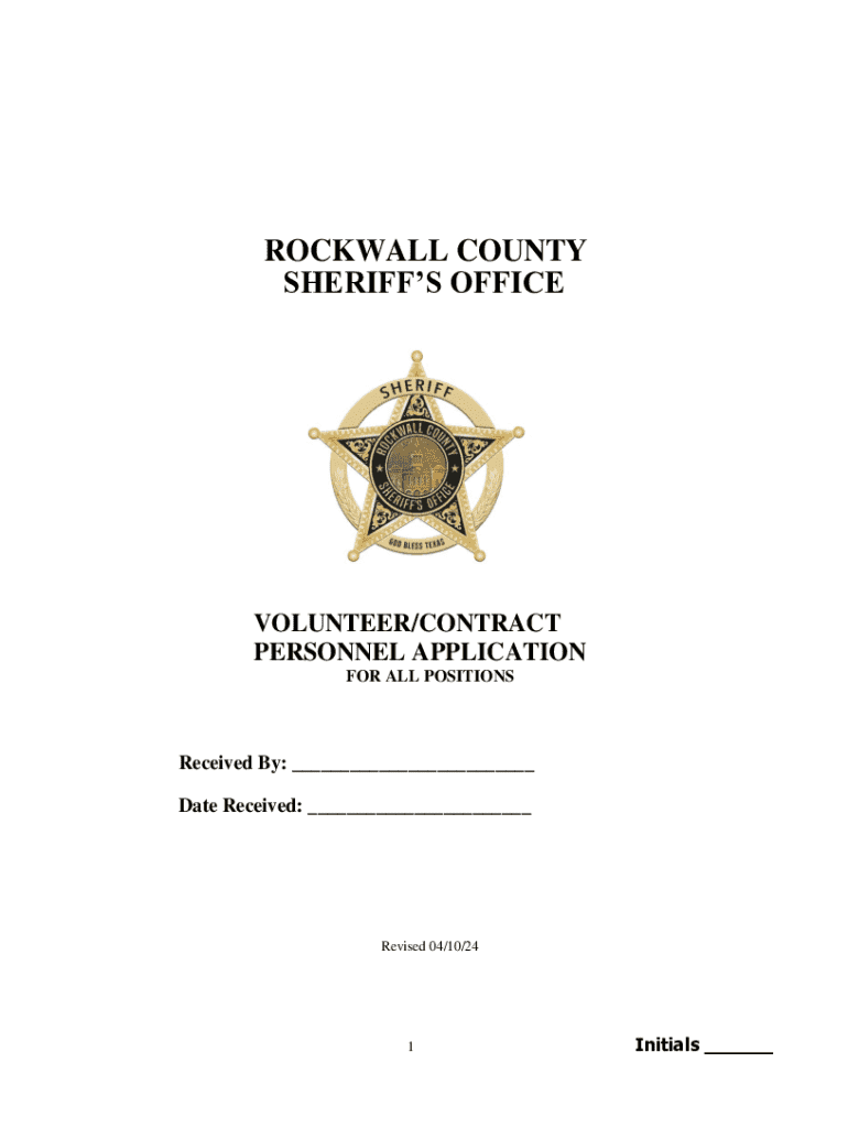 This application is for individuals interested in volunteering or contracting with the Rockwall County Sheriff\'s Office Detention Center. It includes personal information, qualifications, and background