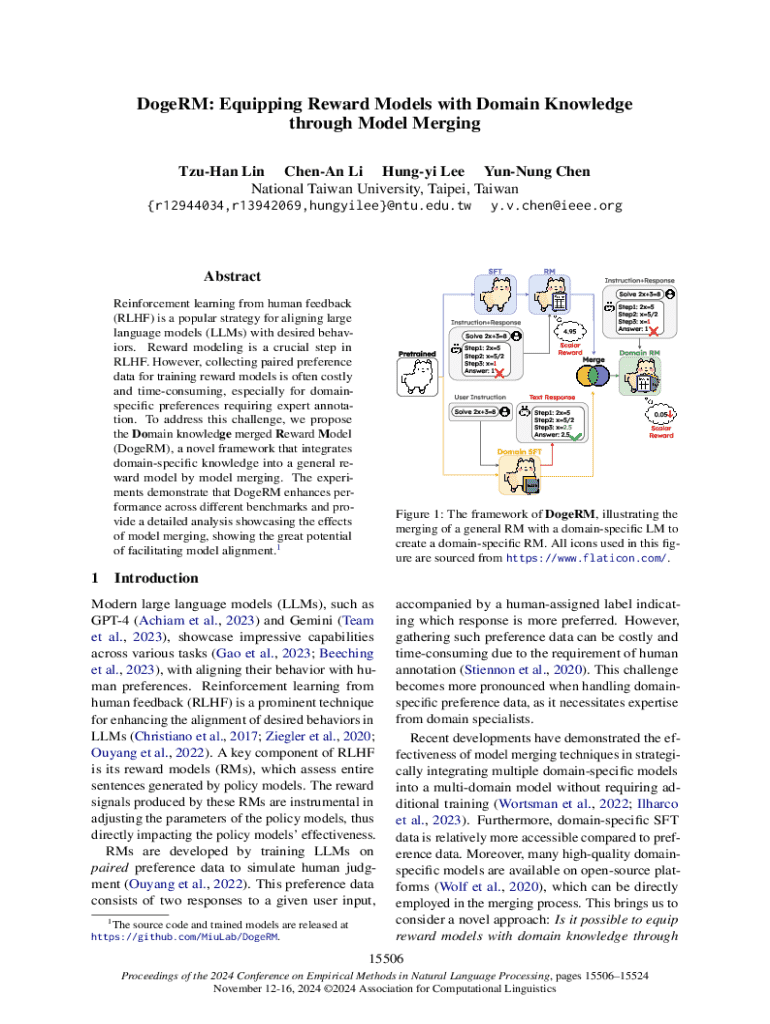 This paper introduces DogeRM, a novel framework that integrates domain-specific knowledge into general reward models through model merging. It addresses the challenges of gathering preference data for reinforcement learning from human feedback (RLHF) by showing that merging reward models with language models fine-tuned on domain-specific datasets can enhance performance in various benchmarks. The study demonstrates significant performance improvements in tasks related to math and coding,...