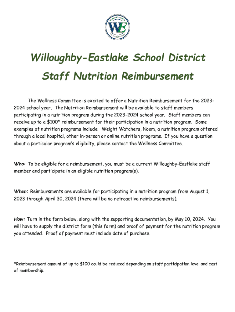 The Wellness Committee offers a Nutrition Reimbursement for the 2023-2024 school year, allowing current staff members to receive up to $100 for participating in eligible nutrition programs. Applications