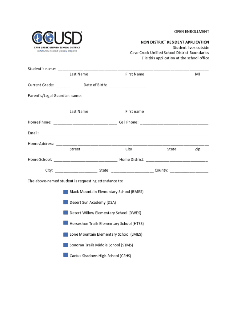Este formulario es para estudiantes que residen fuera del distrito escolar de Cave Creek y desean solicitar asistencia en una de las escuelas de ese distrito durante el período de inscripción abierta.