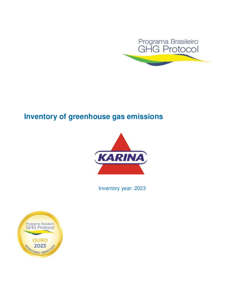 Este documento apresenta o inventário de emissões de gases de efeito estufa da Karina Plásticos para o ano de 2023, incluindo informações sobre as emissões por escopo, limites organizacionais e operacionais, e a verificação realizada por uma terceira parte.