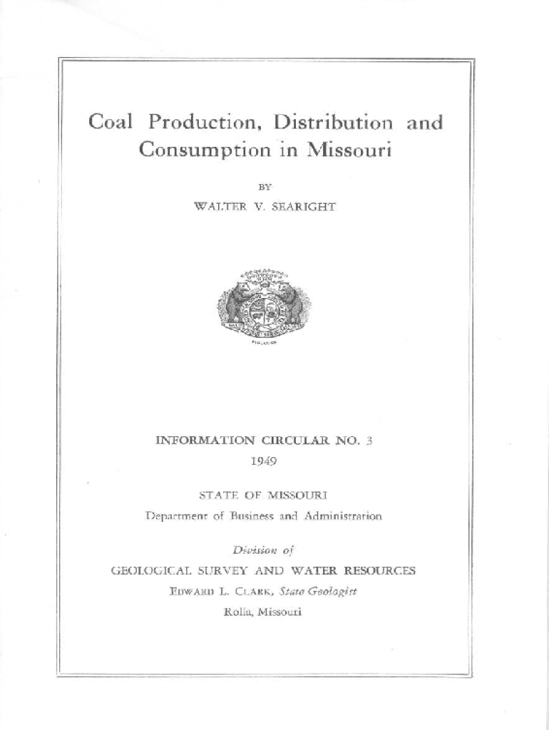 Coal Production, Distribution and Consumption in Missouri BYWALTER V. SEARIGHTINFORMAT ION CIRCULAR NO. 31949 STATE OF MISSOURI Department of Business and Administration Division ofGEOLOGICAL SURVEY AND WATER RESOURCES EDWARDL. CLARK, State GeologistRolla, Missouri575 MID STATE PRJNTING CO., JEFJ\'F..RSON CITY, MO.CONTENTS Page Tablo of Contents .. List or Tllustralions. List of Tabios. . . . . . . . . . . . . . . . . . . . . . . . . . . . . . . . Intrnduction ....... . Acknowledgmn ls