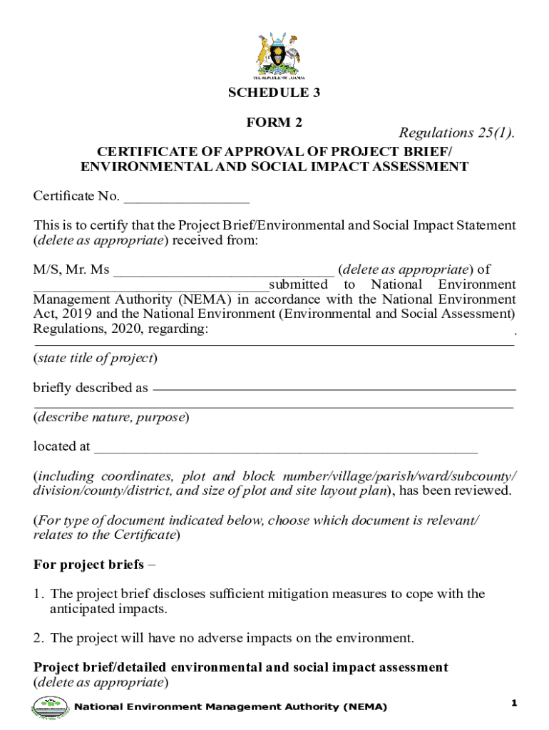 This certificate certifies that a Project Brief/Environmental and Social Impact Statement has been submitted and reviewed by the National Environment Management Authority (NEMA) in accordance with relevant environmental laws. It outlines the conditions of approval, management requirements, and responsibilities pertaining to the environmental impact assessment of a specific project.