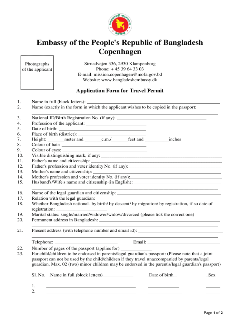 Este formulario se utiliza para la solicitud de permisos de viaje por parte de ciudadanos bangladesíes. Incluye información personal como nombre, identificación nacional, profesión, lugar y fecha de nacimiento, entre otros.