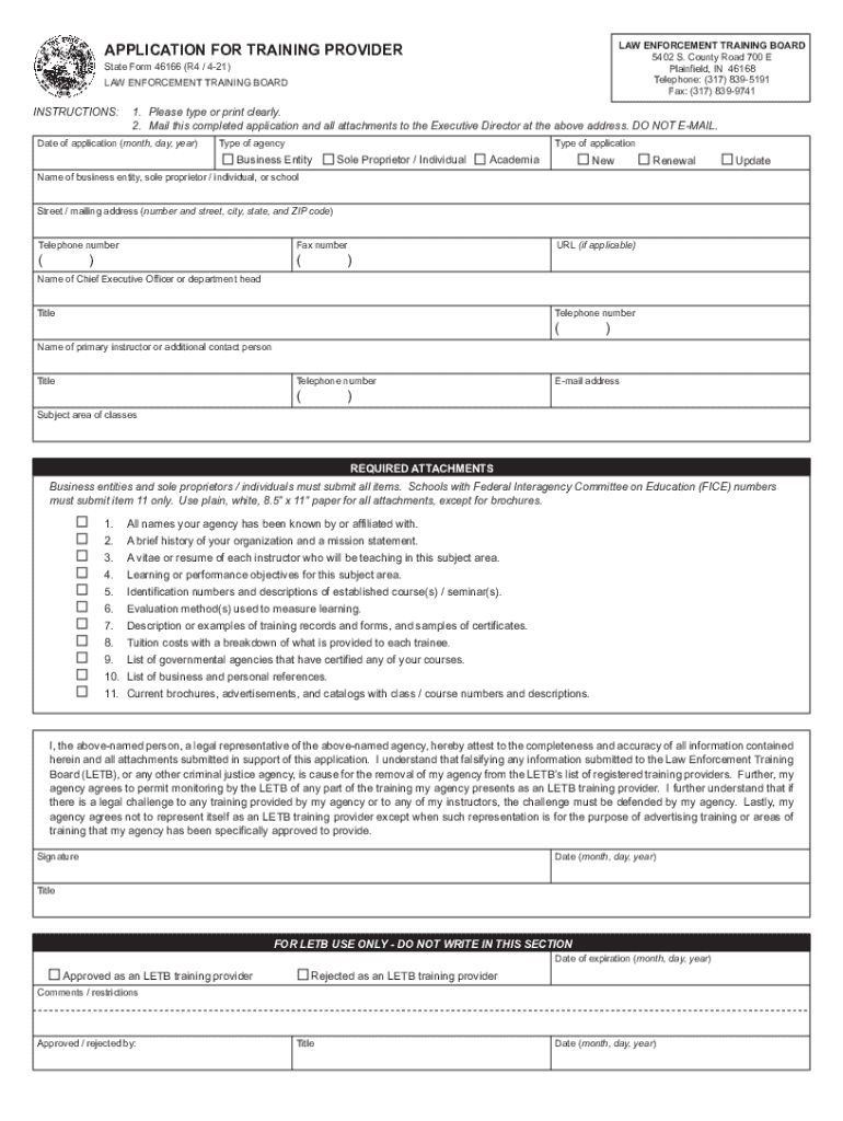 This document is an application for entities wishing to become registered training providers with the Law Enforcement Training Board. It outlines required information, attachments needed, and the legal responsibilities of the applicant.