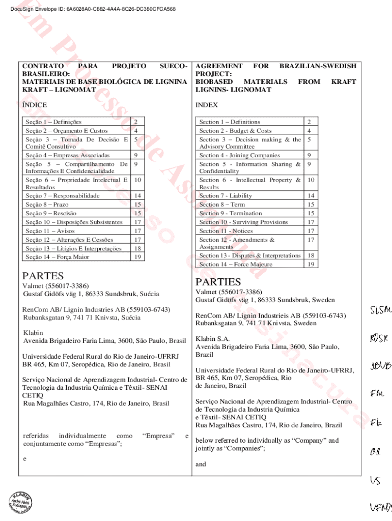 EmDocuSign Envelope ID: 6A6028A0C8824A4A8C26DC380CFCA568 C9DAAB018B6E4BC485FE9B12994A1F3Ea ur at in a s ur As at sin de As so de es so c es oc ro P Pr AGREEMENT FOR BRAZILIANSWEDISH PROJECT: BIOBASED
