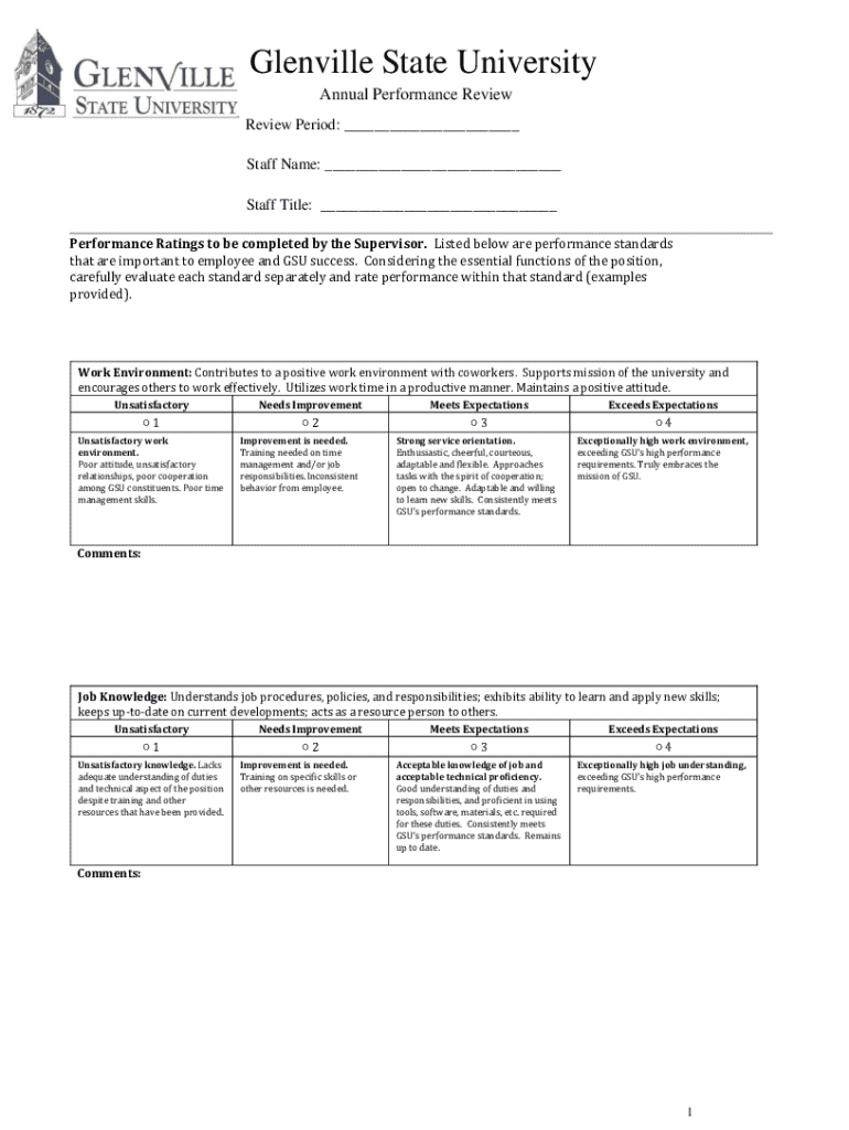 Este formulario se utiliza para evaluar el rendimiento de los empleados de Glenville State University durante un período de revisión anual, tomando en cuenta diversos estándares de desempeño como ambiente de trabajo, conocimiento del trabajo, servicio al cliente, trabajo en equipo, responsabilidad, calidad y cantidad del trabajo, comunicación, habilidad de recursos, relaciones interpersonales, puntualidad, liderazgo y planificación.