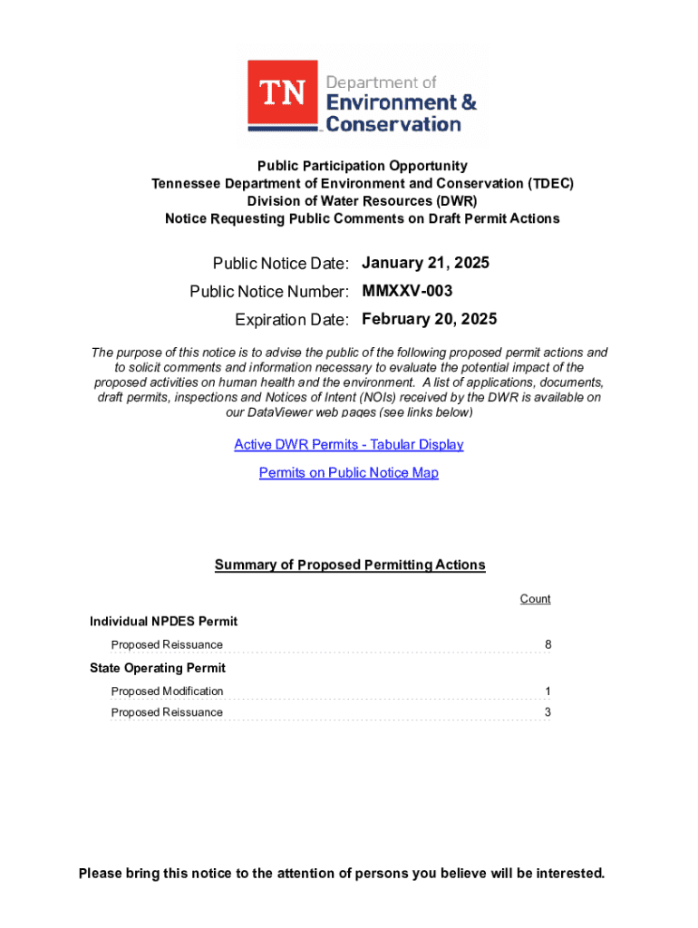 Public Participation Opportunity Tennessee Department of Environment and Conservation (TDEC) Division of Water Resources (DWR) Notice Requesting Public Comments on Draft Permit ActionsPublic Notice Date: January 21, 2025 Public Notice Number: MMXXV003 Expiration Date: February 20, 2025 The purpose of this notice is to advise the public of the following proposed permit actions and to solicit comments and information necessary to evaluate the potential impact of the proposed activities on human...