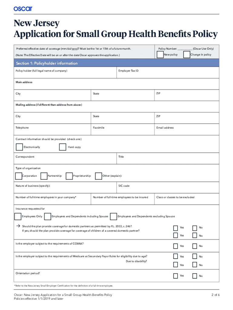 This application form is designed for small groups seeking health benefits policies in New Jersey. Completion requires assistance from an authorized Broker or Oscar Sales Representative. It includes