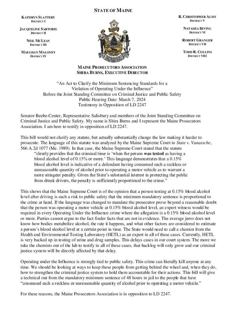 STATE OF MAINE KATHRYN SLATTERY DISTRICT I144 SwedStreet Caribou, 047362353 ALMY R. CME HRISTOPHER 2074982557DISTRICT V FAX 2074933493 ___NATASHA IRVINGJACQUELINE SARTORISDISTRICT VI 27 Riverside Drive PresqueRIsle, ME G 047692730 OBERT RANGER 2077640504DISTRICT VII FAX 2077642046 ___DISTRICT IINEIL MCLEAN DISTRICT IIITODD R. COLLINSMAEGHAN MALONEY DISTRICT IVMAINE PROSECUTORS ASSOCIATION SHIRA BURNS, EXECUTIVE DIRECTORDISTRICT VIII 25 School Street Suite 210 Houlton,